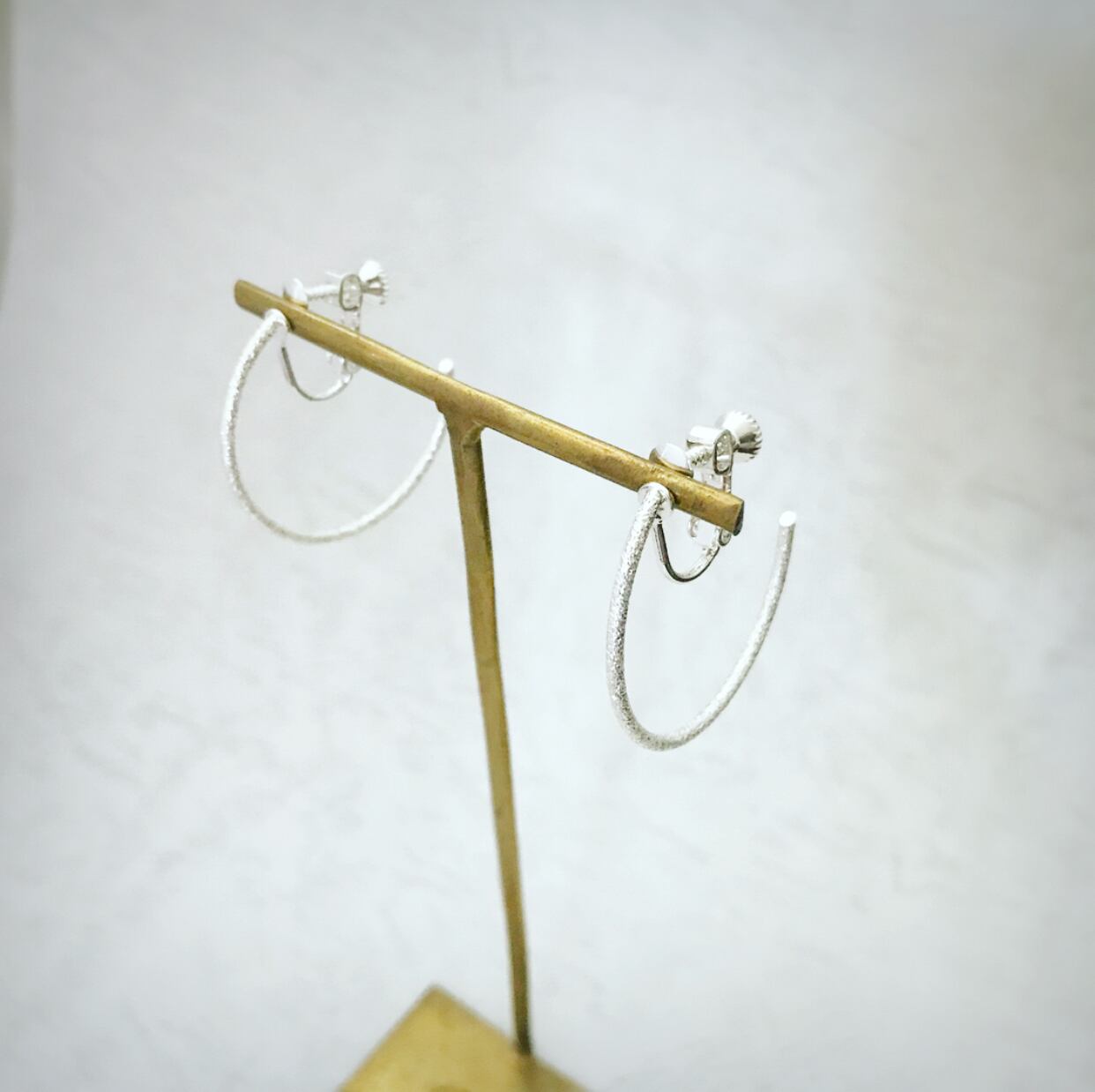 つけるだけでこなれ感を演出してくれるシンプルなフープイヤリング。艶のあるシルバーと凹凸フォルムでキラキラと煌めき、 女性らしい耳元を演出します。 大人カジュアルなスタイルに。 合わせやすいサイズ感でデイリーにご使用できます。