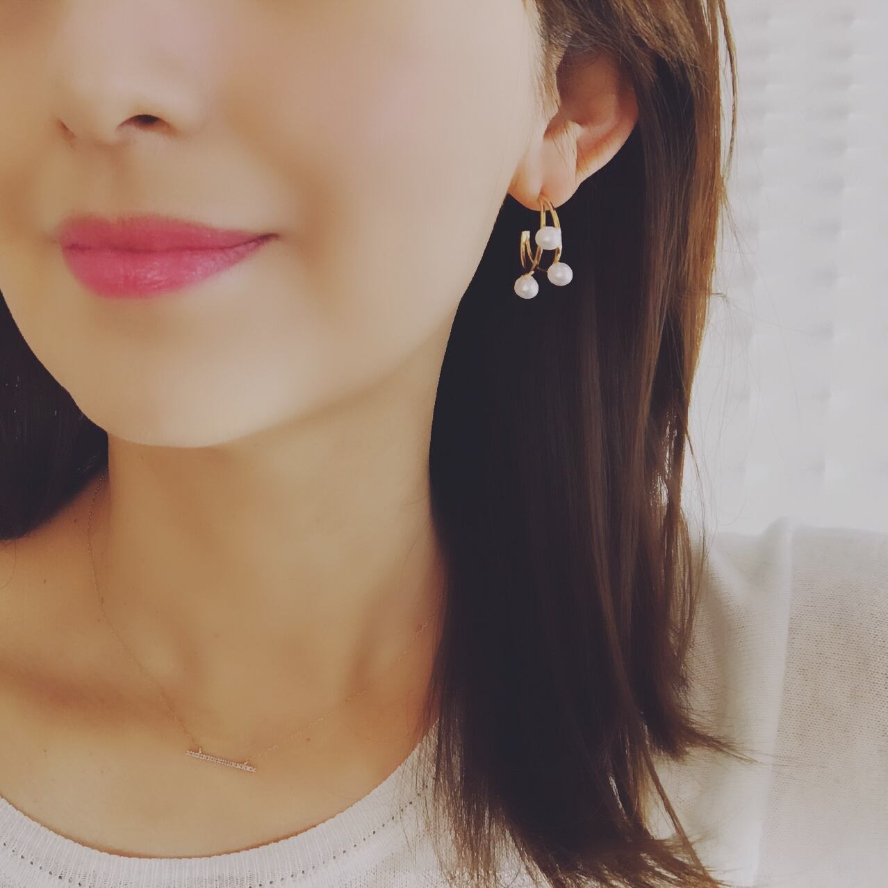 デザインゴールドのCカールデザインピアス。 360度どこから見ても違った表情で楽しめます。 3つのパールが華やかさをプラス。どんなスタイルにもマッチします。